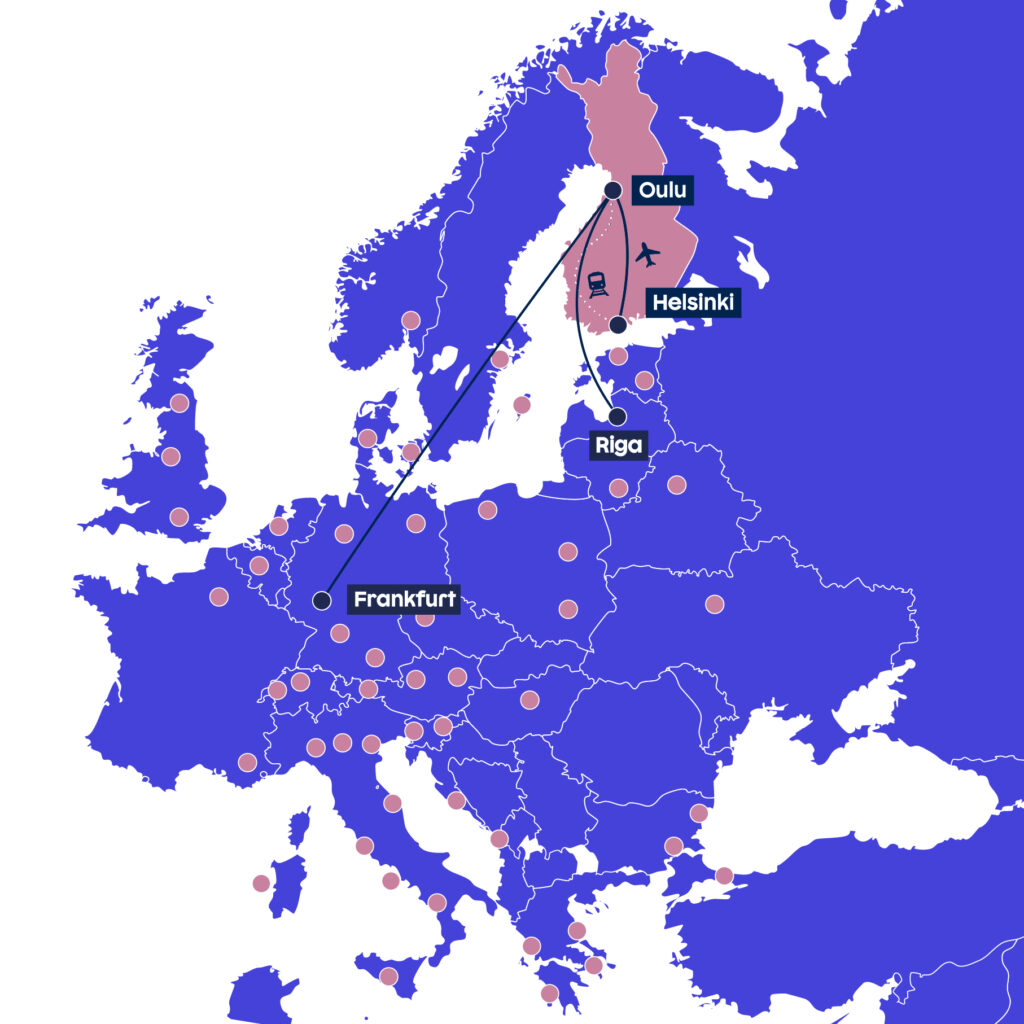 Oulu ist mit verschiedenen Verkehrsmitteln leicht erreichbar. Die Stadt verfügt über den zweitgrößten Flughafen Finnlands und bietet bequeme Direktflüge von Finnair aus Helsinki. Zusätzlich werden ab März 2026 direkte Air-Baltic-Flüge aus Riga angeboten. Häufige Zug- und Busverbindungen aus ganz Finnland sorgen ebenfalls für eine angenehme und reibungslose Anreise nach Oulu.