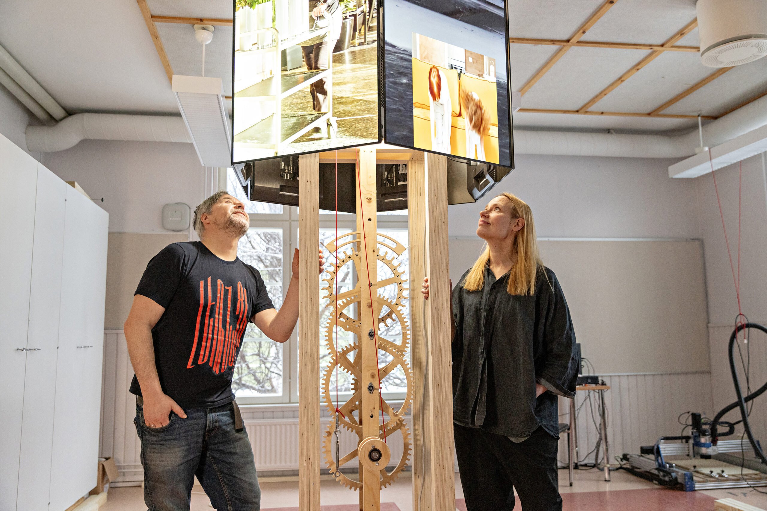 Klockbyggare i arbete, mitt i bilden konstnärerna Tellervo Kalleinen och Oliver Kochta-Kalleinen. Foto: Henri Luoma.